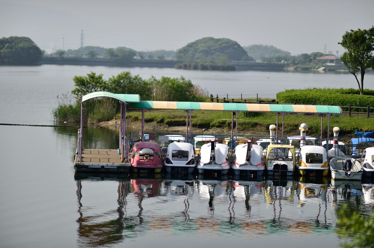 早朝の池には朝日に照らされて利用者を待つボートが水面に綺麗な姿を写しながら勢揃いして居ました。