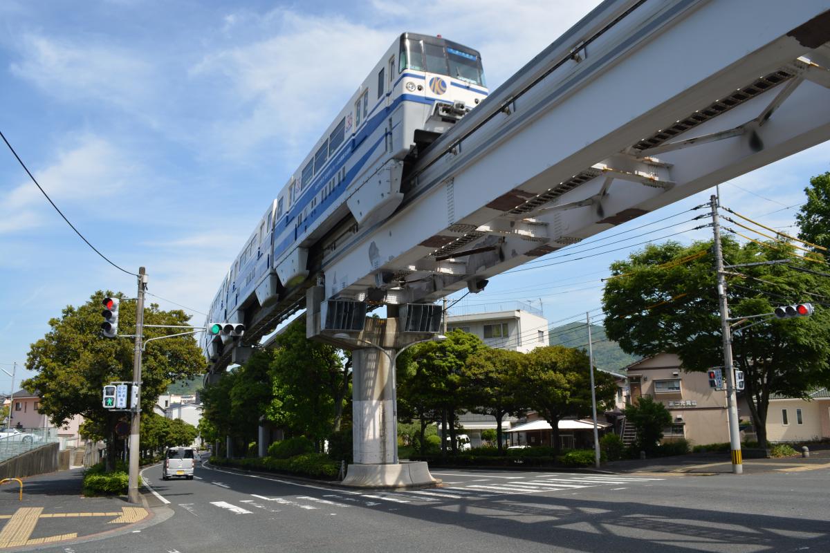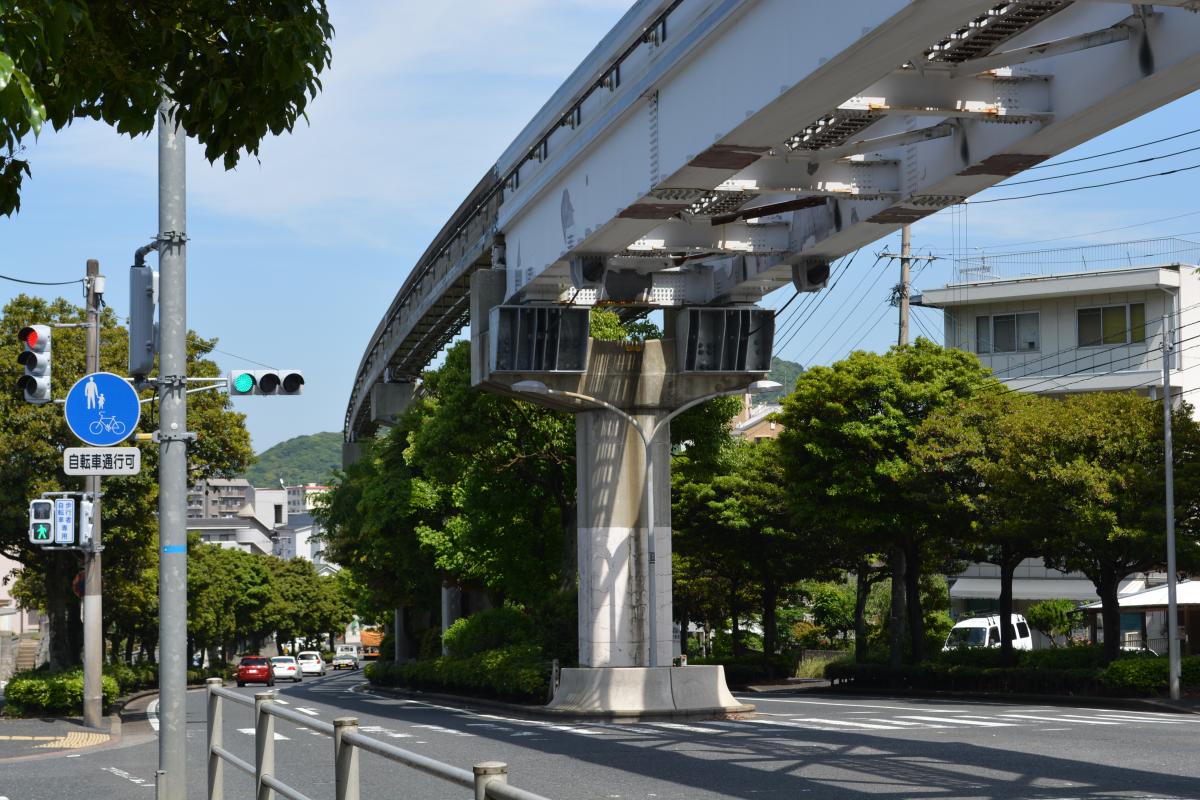 幹線道路の中央分離帯に植樹してある風景は良く見かけるが、モノレール沿線のそれは、樹木の頭上に軌道が通っているため、独特の景観となっている。中でも志井駅手前で、ジェットコースターばりにやや曲がりながら下る様は、まるで「まちなかテーマパーク」ともいうべき風情である。特に新緑の時期はちょっとしたジャングル的な雰囲気醸し出し、わくわくさせてくれるのである。