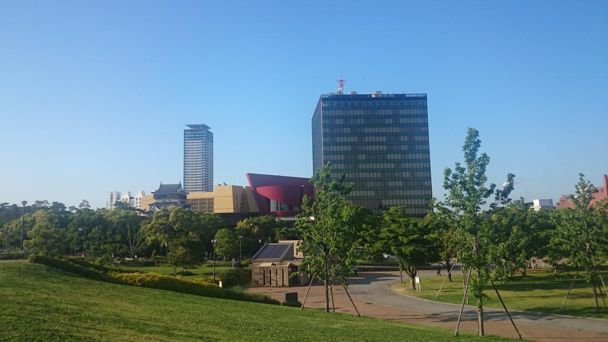 青い空に豊かな緑、リバーウォーク北九州のカラフルで現代的な建物と、歴史ある小倉城、北九州の魅力が一枚の写真に収まりました。