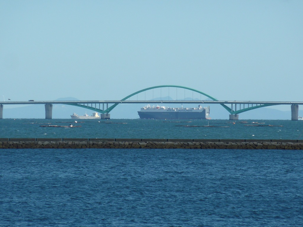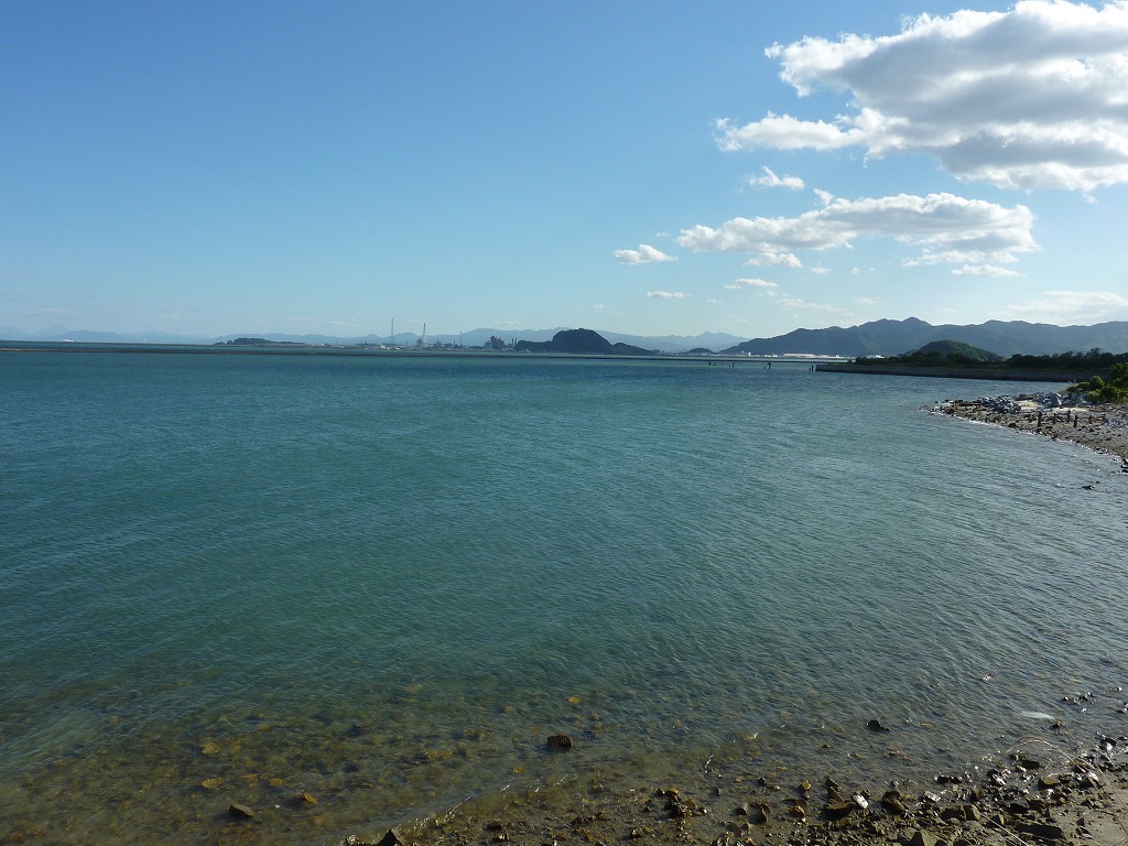綺麗な入江、新北九州空港連絡道路(橋)、対岸のセメント工場等があります。