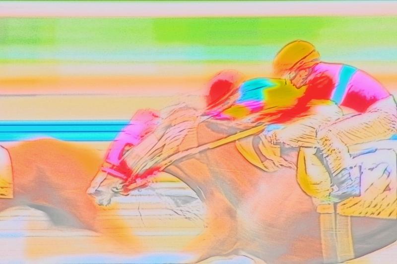 馬に乗った騎手がコーナーを駆け抜ける姿、