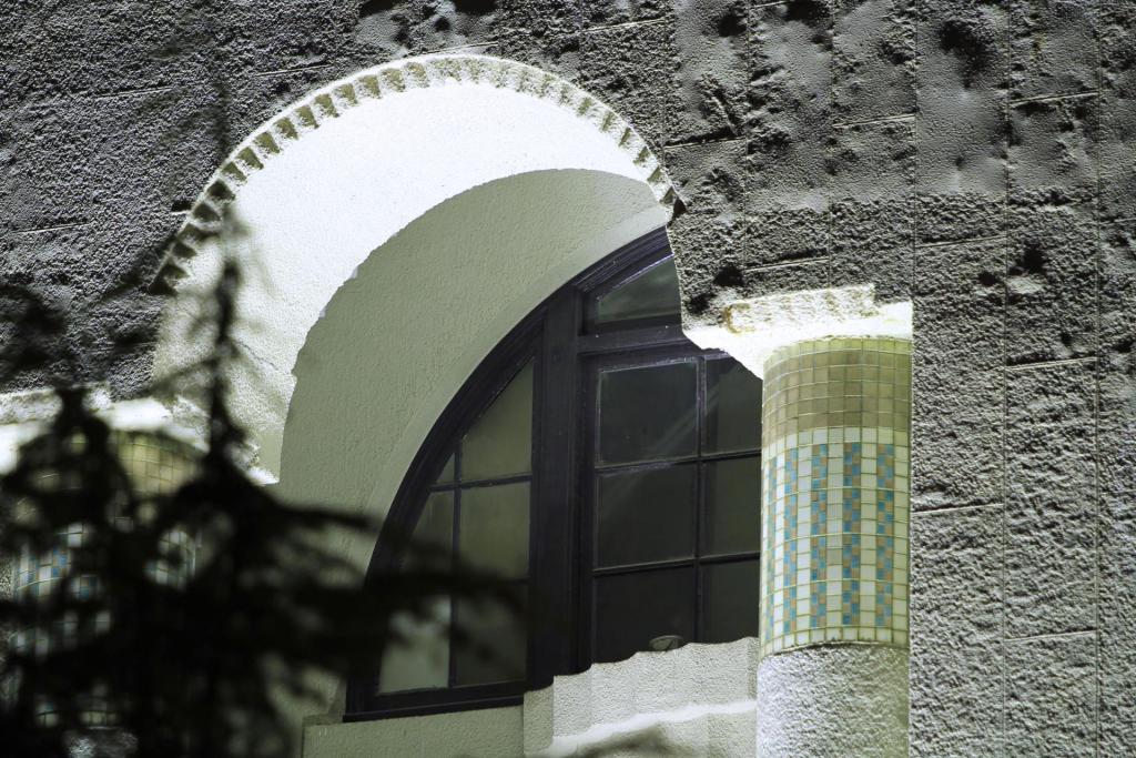 車寄せの外観や細部の抽象的な曲線に色タイルの使用など、