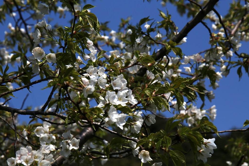 少しグリーンがかっているような花を咲かせています。青空に似合うきれいな桜でした。オオシマザクラはソメイヨシノより早い時期に咲き、花と葉が同時期に開くようです。