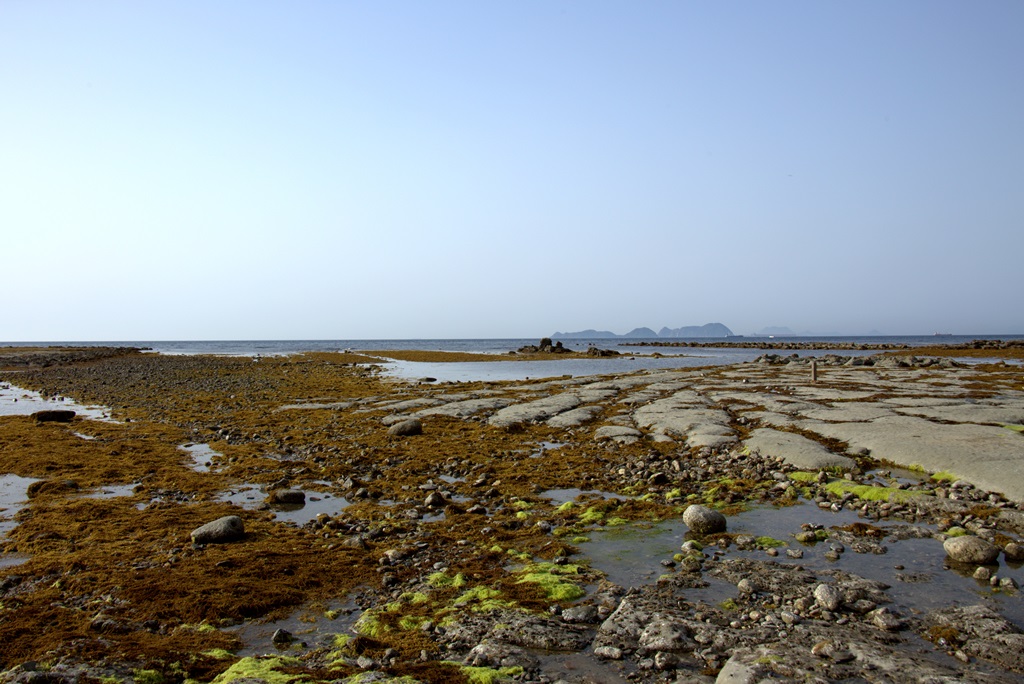 国道495号線沿い、北九州市営バスの停留所の逆水から海岸側に向かうと、潮が引くと岩の畳が顔を出し、その岩場をつたって少し沖の方まで歩いて行ける場所があります。ともろビーチと遠見ヶ鼻の中間くらいのところです。この日、中潮で、午後4時半頃が干潮を迎え、岩畳を確認することができました。今は初夏で夕暮れまでの時間にはまだまだ陽が高く、穏やかな風に潮の香りを感じます。