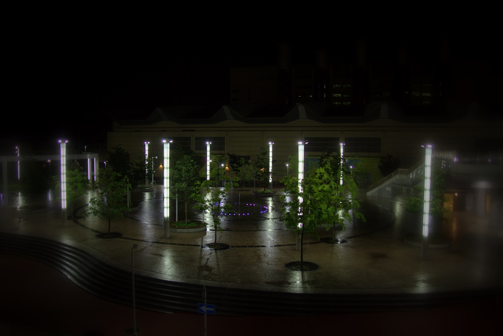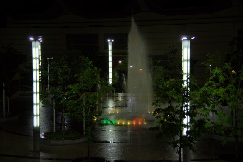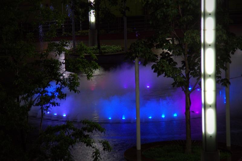 噴水があり、ミストも出て夏の暑い日はひんやり。夜あるくと色鮮やかなネオンを浴びて美しく輝いていました。