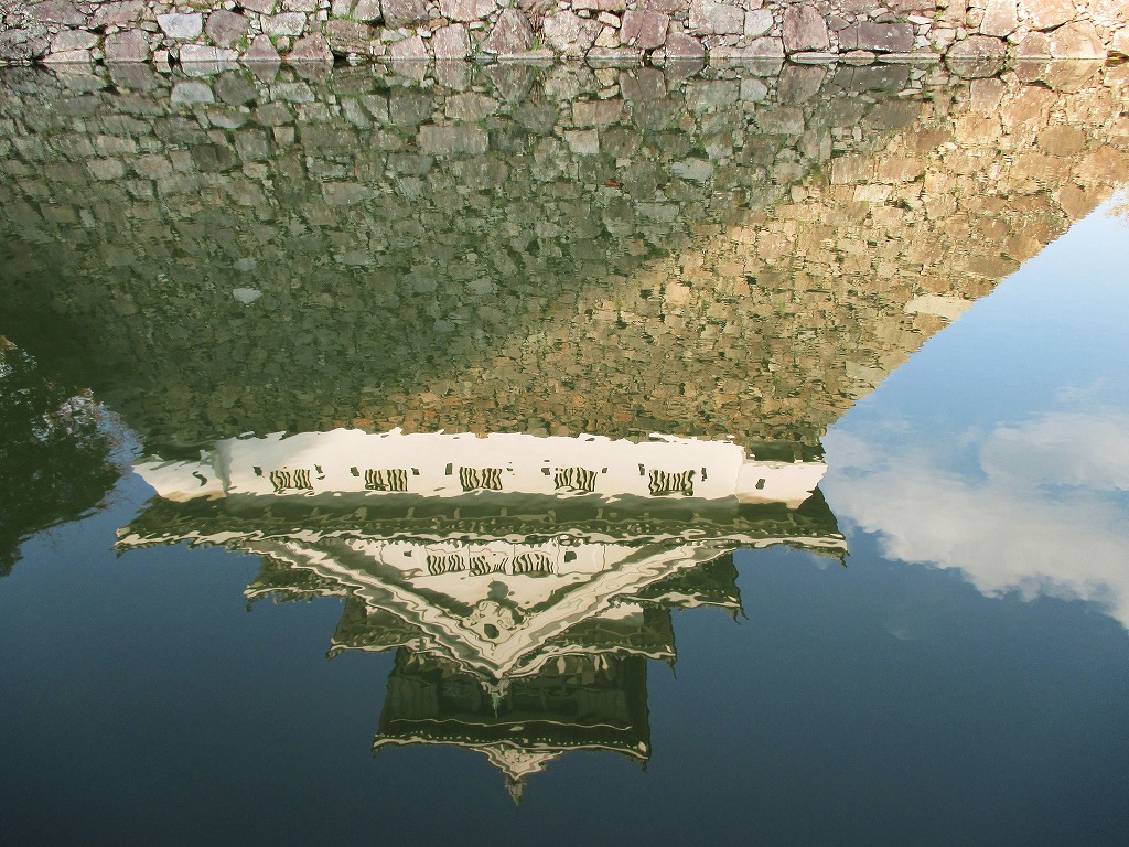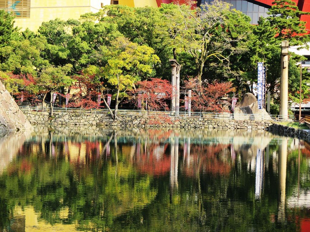 ふとお堀に目をやると、リバーウォークや天守閣が綺麗に映り込み、絵画を