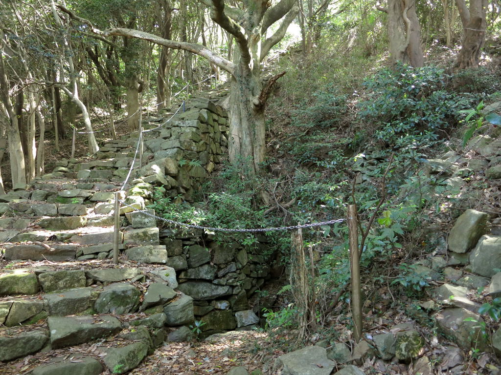その中で最も低い花尾山に残る花尾城跡は、中世の山城としては石垣が多く残る県内屈指の遺跡です。主郭(山頂)と台所郭と呼ばれるところから、北側に2条の石段と井戸跡?(いろいろな説があるようで確定していないようです)が残っています。東側の1条の整備された石段を手すりをつたって下ればこの井戸跡?遺構があります。