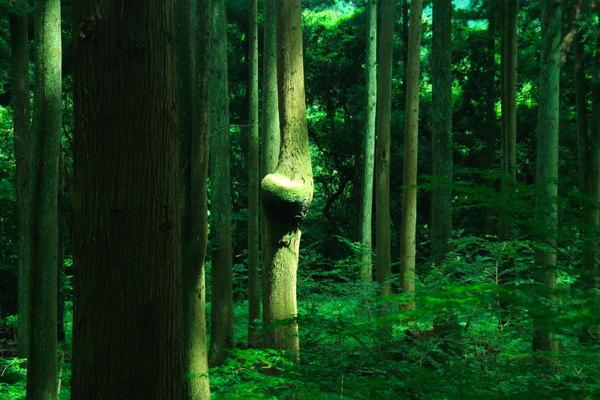 木漏れ日の中のコブ杉を横目に段々と森の中へ・・不思議なグリーンの世界に癒されていきます。