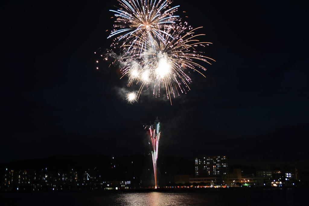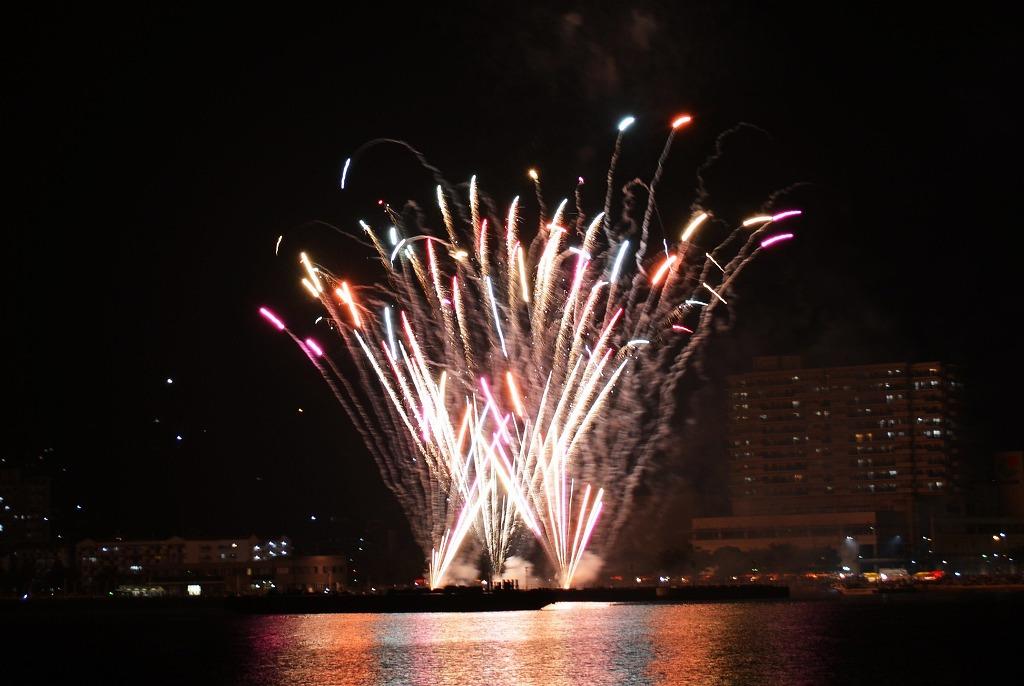 海面に色とりどりの花火が反射して、とても綺麗です。