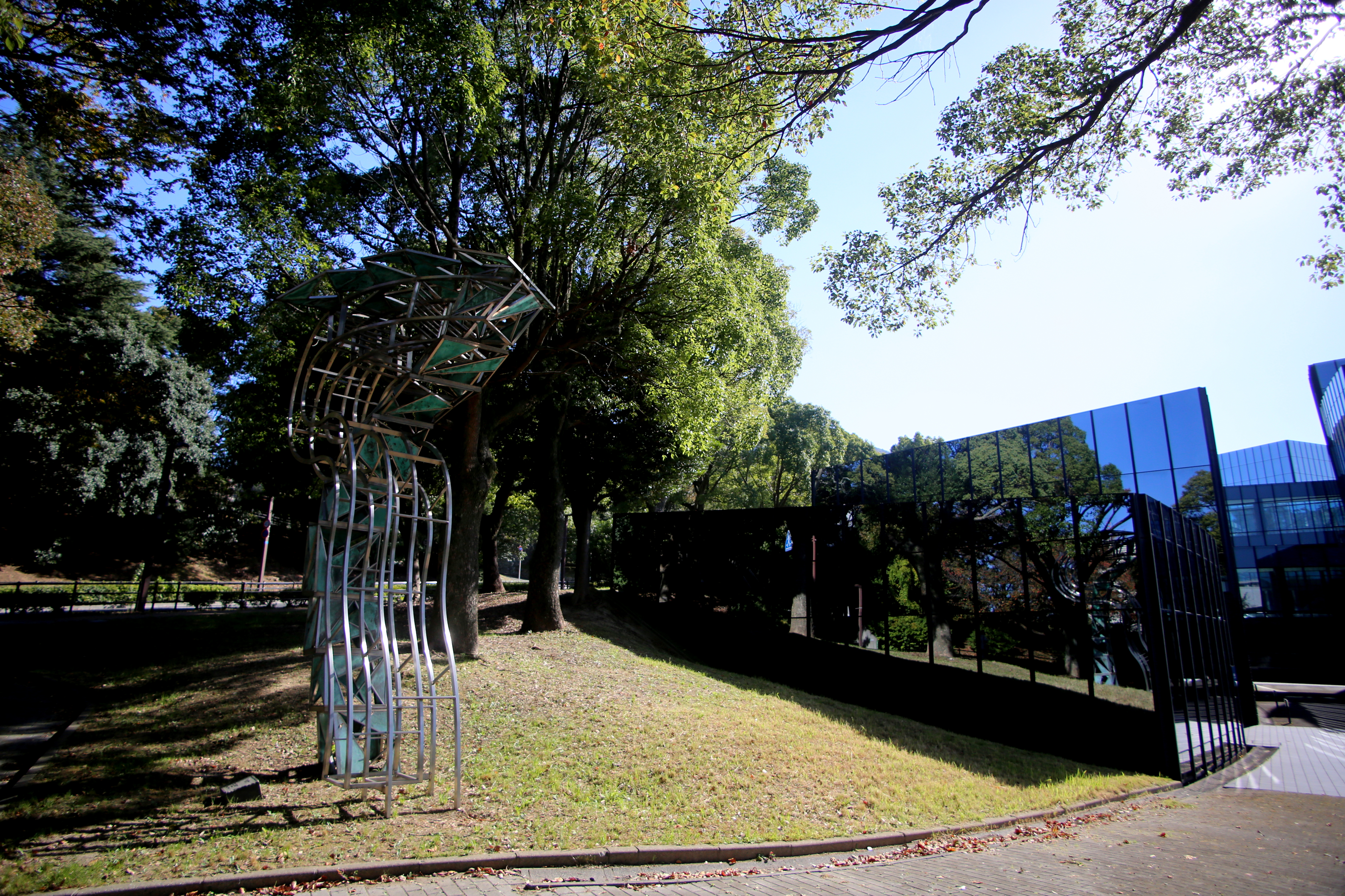 国際交流村センターのガラス張りに作品が写り2倍楽しめること請け合いです。