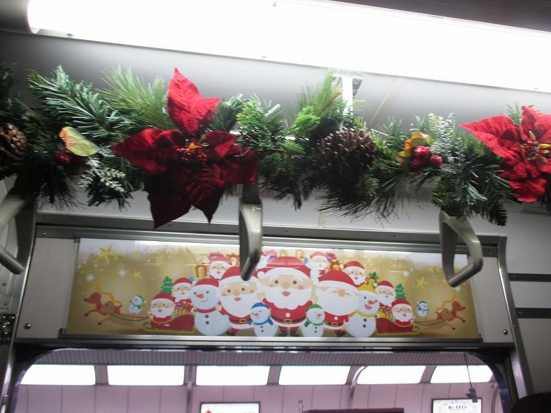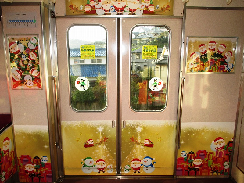 吊革にもサンタのイラスト、ドア周りにもいっぱいです。