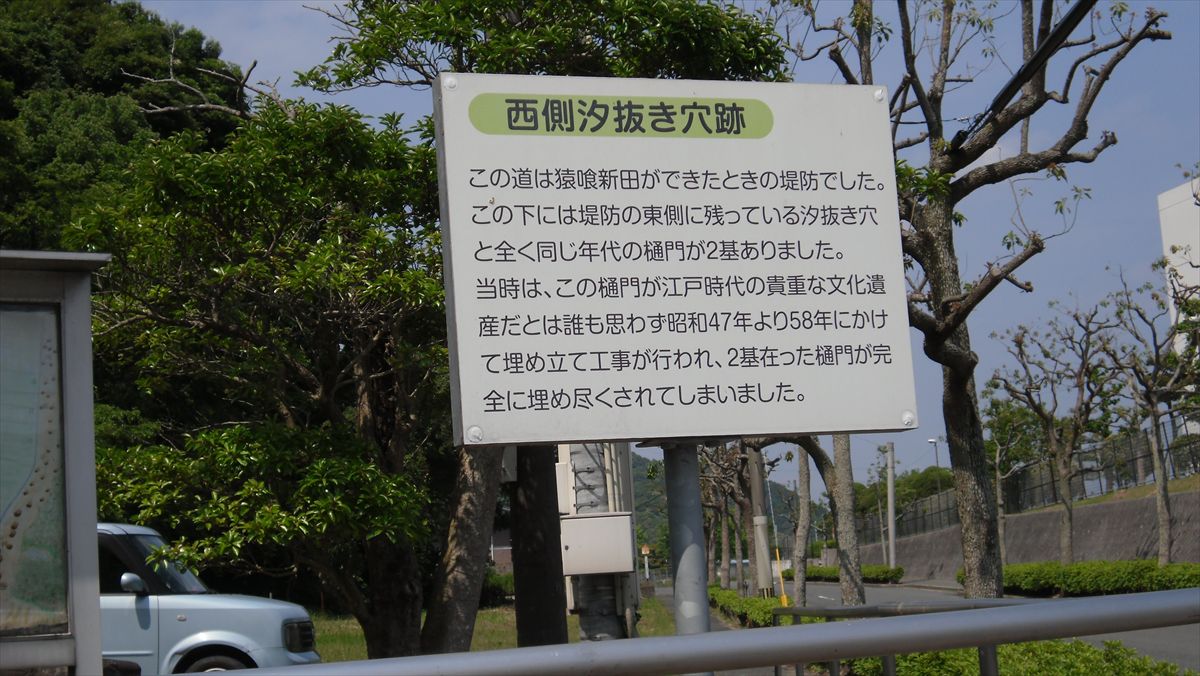 猿喰新田の中央には灌漑用水路である中川が流れており、海への排水用の暗渠が湾の両端に2基ずつ築かれました。これが「汐ぬき穴」と呼ばれている樋門で、海水を新田に流れ込まさず、河川の流れを海へ流す役目をしました。汐抜き穴は堤防も含めて2年間をかけて整備され、当時設置された4箇所のうちの2箇所が現在も残っています。