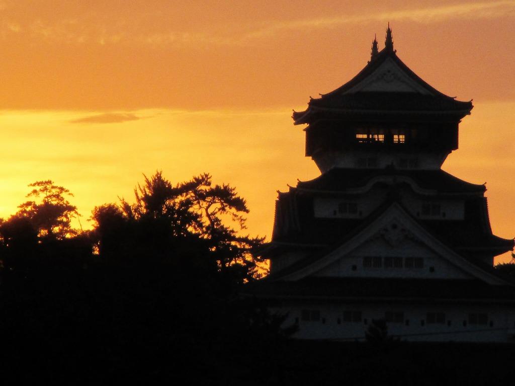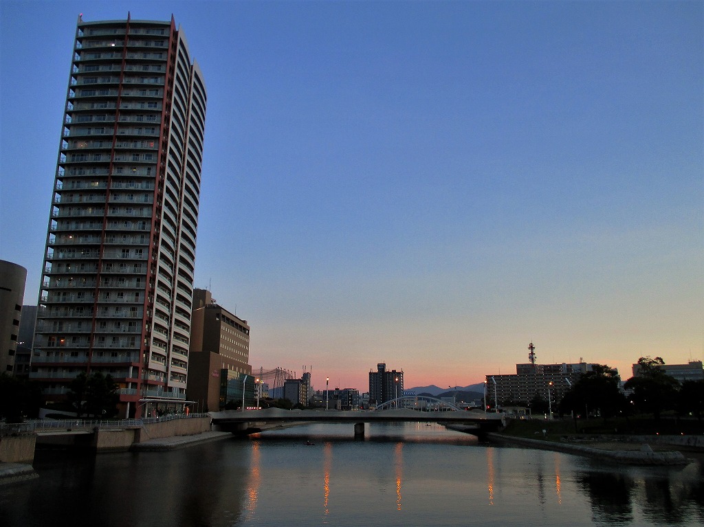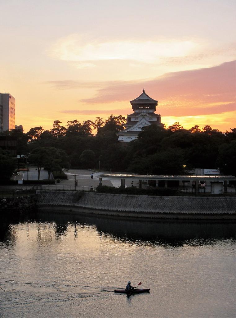 鴎外橋が架かる紫川でカヌーを漕ぐ人、夕焼けにシルエットで浮かぶ天守閣・・・涼しげな風景です。
