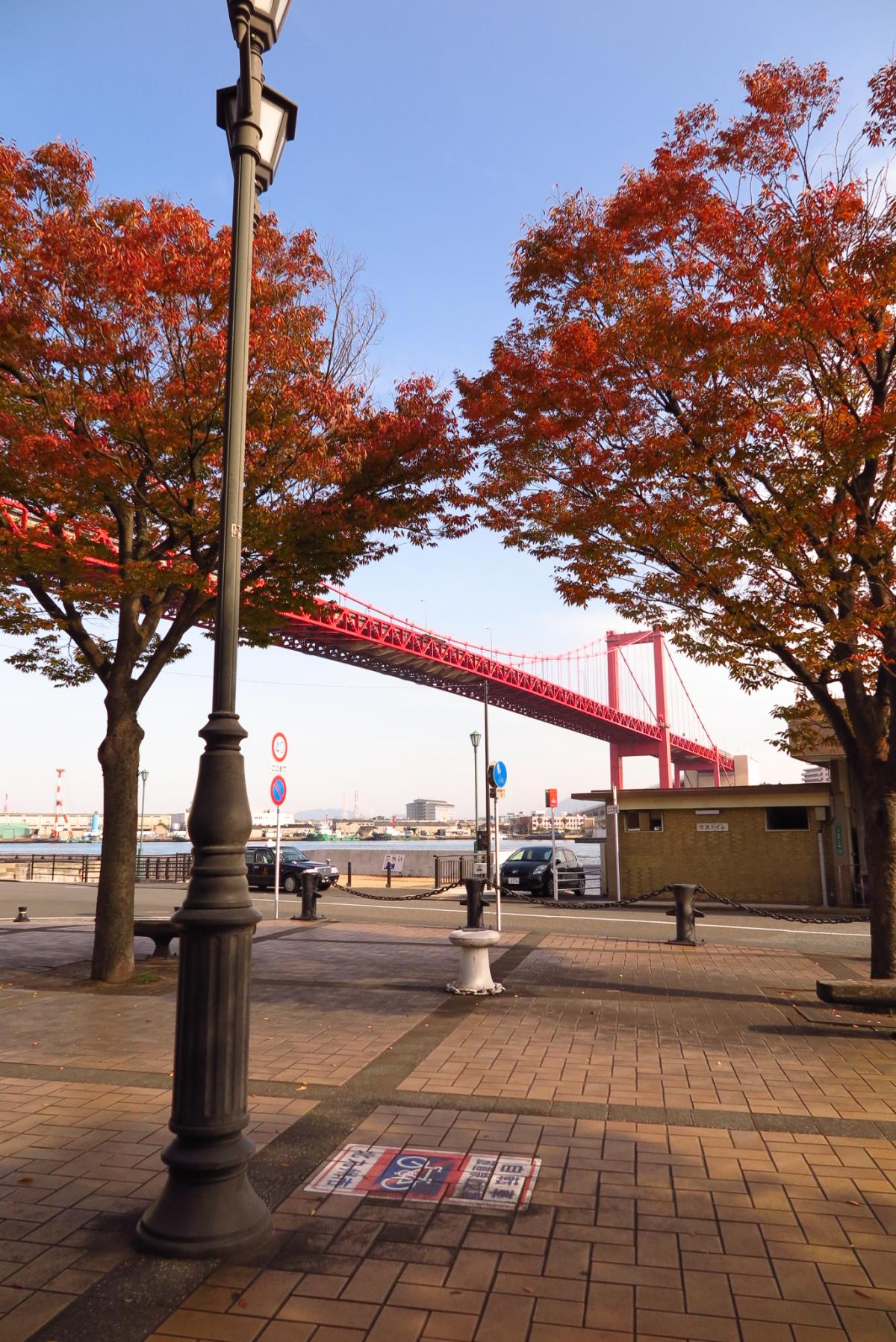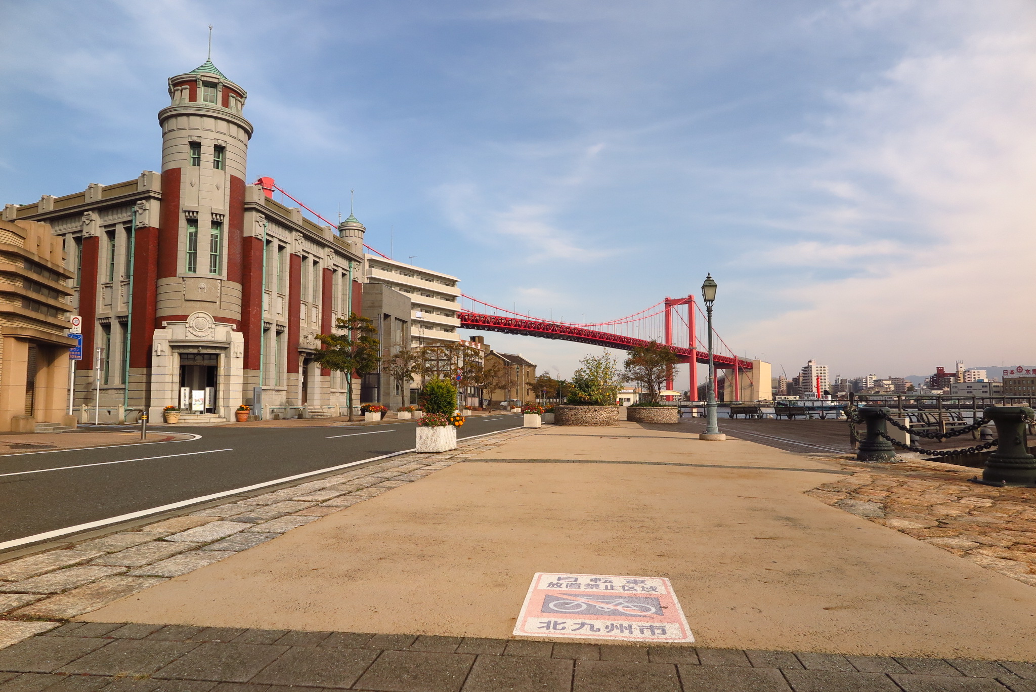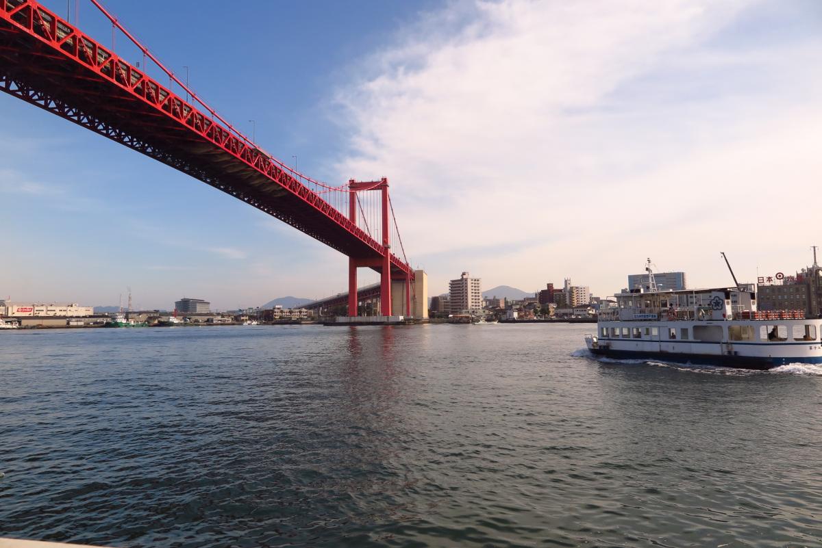 夕陽浴びて朱色あざやかな大橋、青い空、青い静かな洞海湾、航行する渡し船は滑るようだった。発見、感動