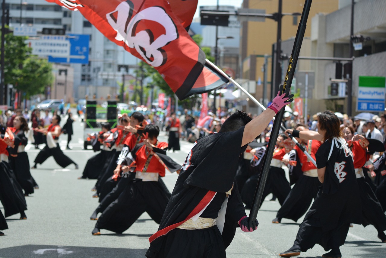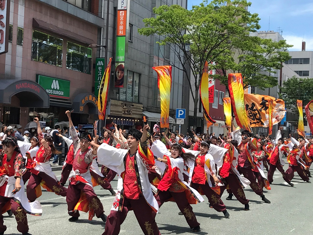 ふれあい通りは前進しながら演舞するという本来のよさこい踊りが、