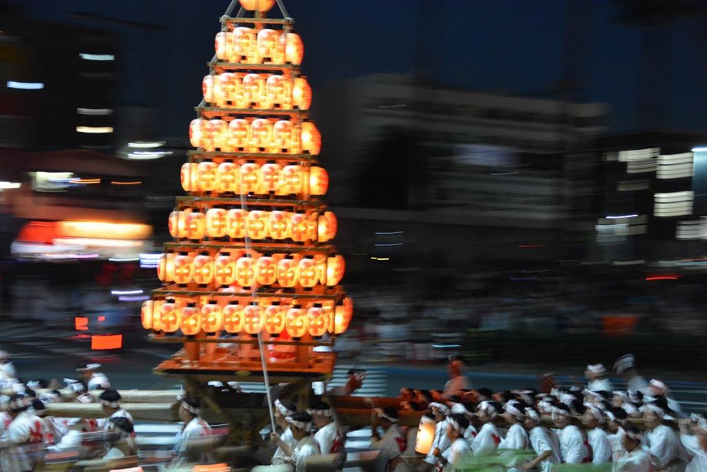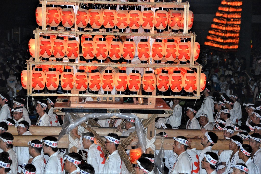 光のピラミッドに姿を変えた提灯山笠が抜きつ抜かれる競演は