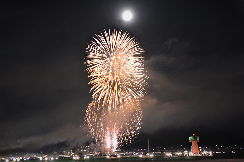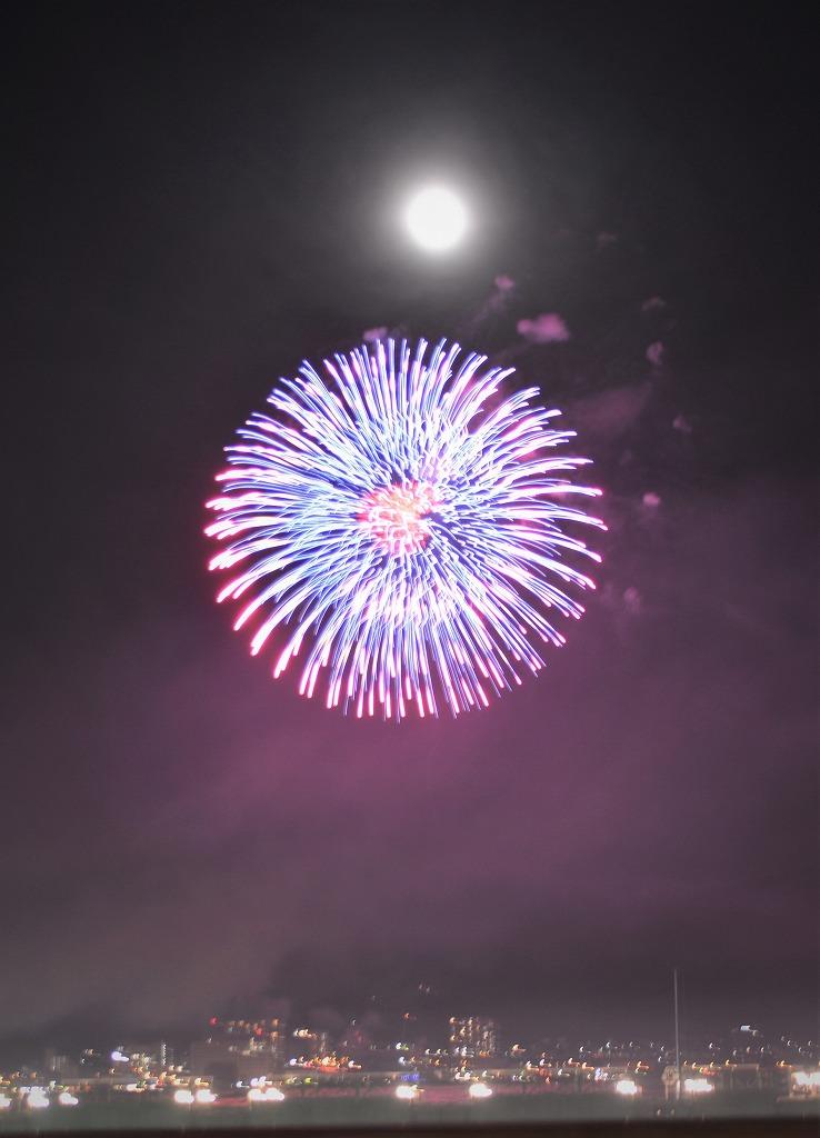 門司港の上には満月、花火とのコラボの写真が撮れました。