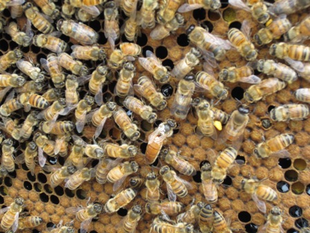 人は上の段の卵を産まない巣から採蜜します。