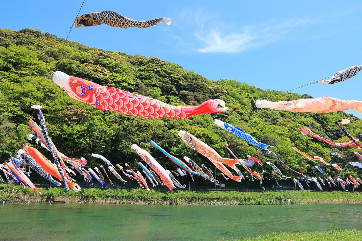 青空と深緑の森、紫川を背景に、美しく泳ぐ鯉のぼり達。たくさんのファミリーが見に来てました。