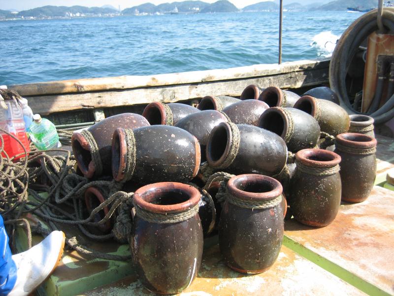 関門海峡という狭い海域に生息するタコは、数量的には少ない。タコはアワビやウニと同じで、勝手に獲っては密漁にあたる。資源が枯渇しないように小さなタコは放流し、タコの禁漁期間を設け、産卵用の壺を海に沈める活動を行うなどして、資源の保護に努めている。ここで生きる漁師さんたちは、ただ獲るだけではなく、資源を育み、守り、そして後世へつなげていくための活動もおこなっているのだ。日頃の漁を行いながら、資源保護のための活動も平行しておこなう。文章で書けば簡単なことかもしれないが、それはそれは、本当に大変なことなのだ。