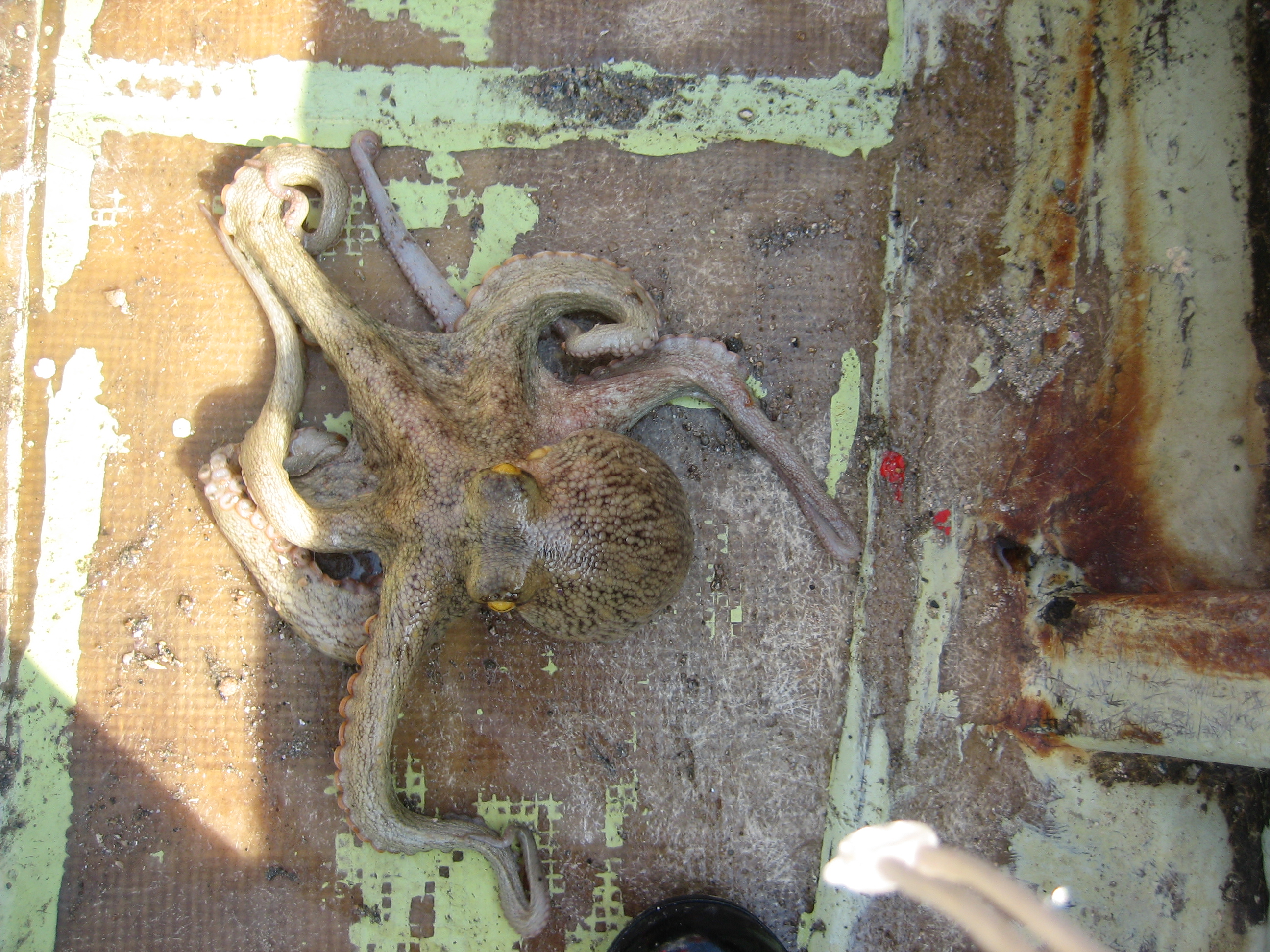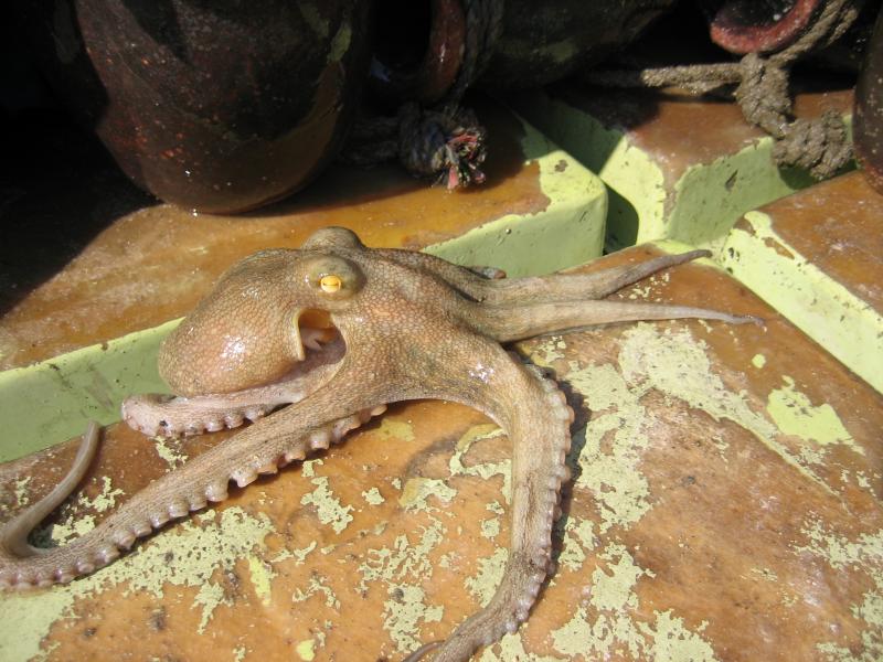 出た出た出たぞ!タコ壺から、放射状にたくさんの足を動かしながら、彼が現れる。ものすごいパワー、勢い、スピードで甲板を移動する。関門海峡の速い潮流に負けないように、岩にしがみつき育ったため、足が太く、短く、吸盤が足の先までついている。しばらくすると、漁船は引き上げられたタコでいっぱいになった。