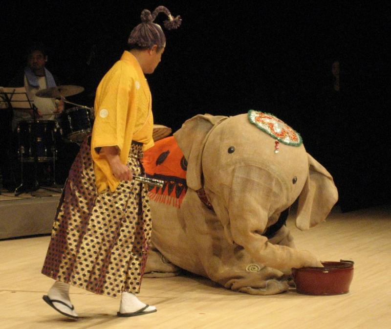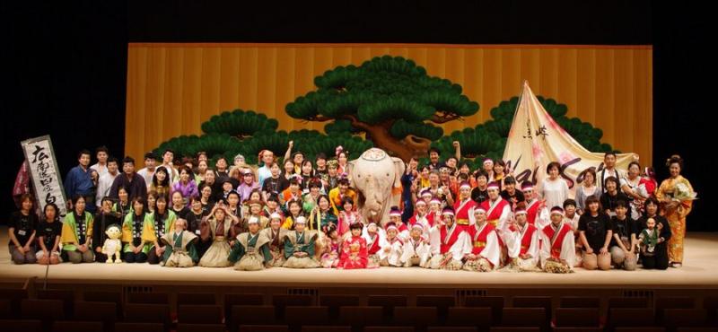 和の雰囲気に飾られた会場は、開演10分前から「南京玉すだれ」で早くも盛り上がり、開演後は「黒崎wavsav」の皆さんが、よさこいで華やかにオープニングを飾ってくれました。その後、白象くんが江戸にやって来たことを知らせる”チンドン屋”がビラをまき散らし、軽やかな音楽を奏でながら、会場を回っていきます。そしてこのあと、会場に白象くんが登場。会場をゆっくり歩き、舞台にあがり将軍吉宗公とその家来たちのもとへ・・・。