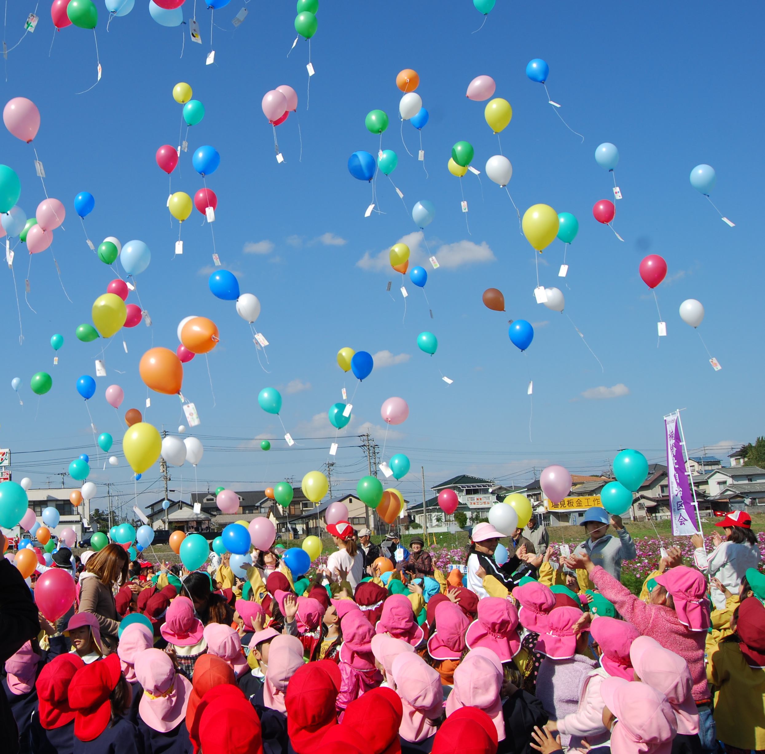 その後、みなさんのお楽しみは「風船とばし」です。風船にメッセージをつけて皆さんいっせいに飛ばします。 「風船飛ばしをやると、子どもたちの喜びようはすごいですよ。それまでの苦労がいっぺんに吹き飛ぶ感じです。さらに、風船のメッセージを読んだと、広島や熊本の人たちからうれしい便りをいただくことも。コスモス畑ができてから、ごみの不法投棄は全くなくなり、まちの環境美化に役立っていると実感できるのもやりがいです」と会の方の感想です。